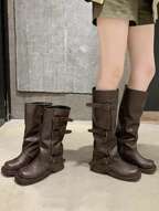 2025년 가을/겨울 슬리밍 스웨이드 니하이 미드-카프 청키 힐 뾰족코 여성용 승마 부츠, 웨스턴 부츠